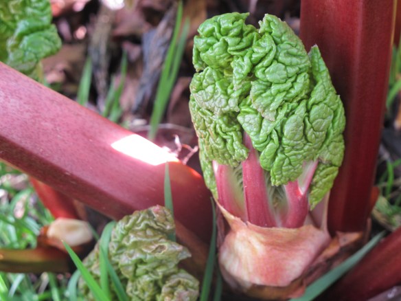 Screamingly irrelevant (and late) photo: Rhubarb, just coming up. I took this in February–early in the month if I remember right. After living in Minnesota, I can’t believe what we get away with here. If rhubarb comes, can spring be far behind?